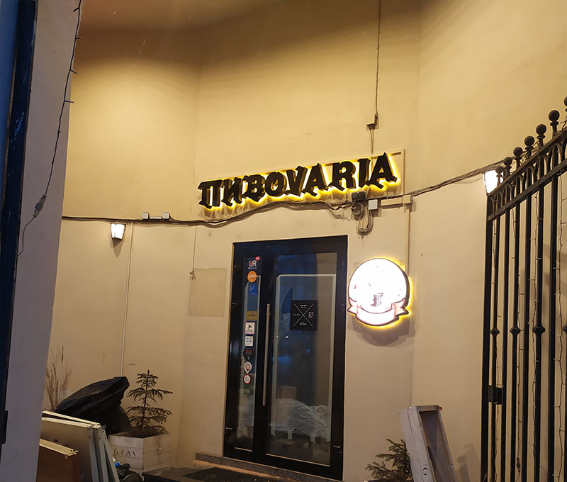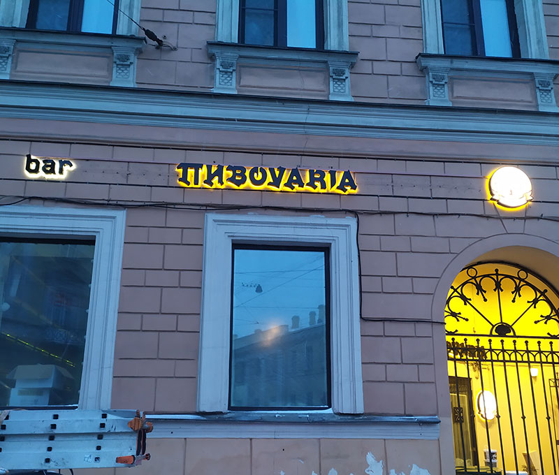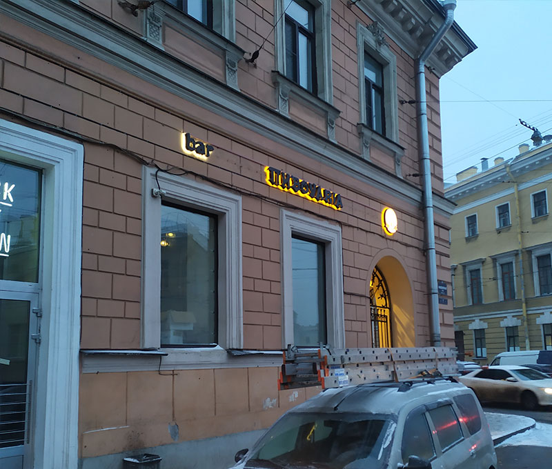 Эта разновидность благодаря своей ненавязчивости подойдет для оформления интерьера в помещении. Свет, размещенный по контуру буквы, создает эффект парения надписи в воздухе. Для использования контуражной подсветки на улице будет достаточно поменять параметры яркости вывески.